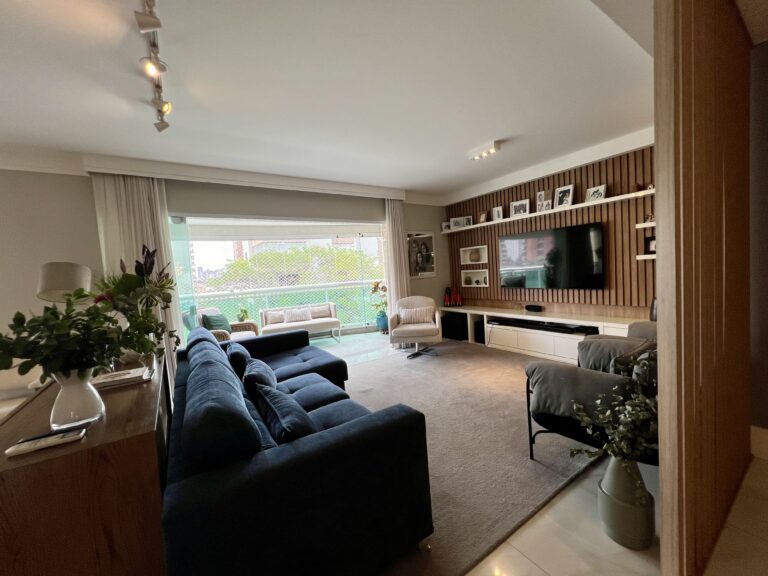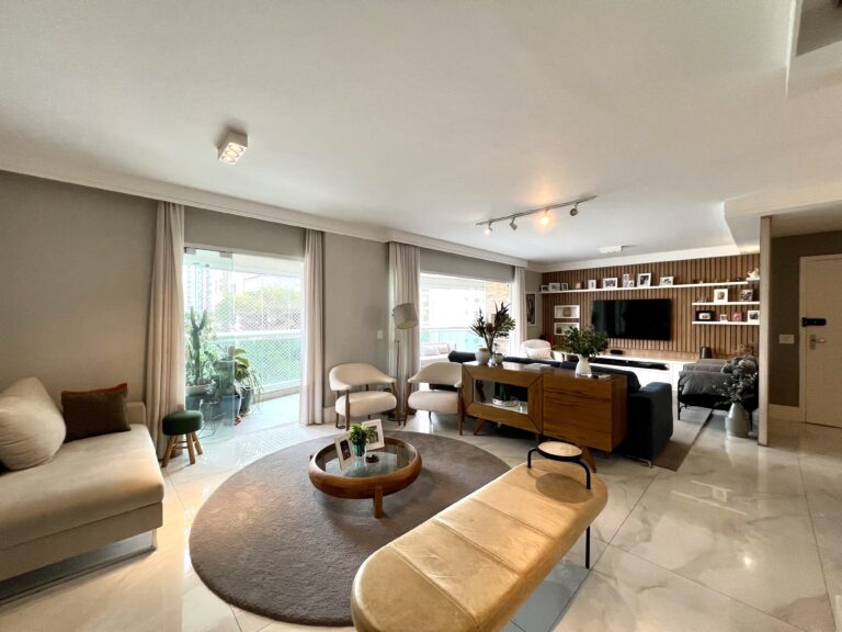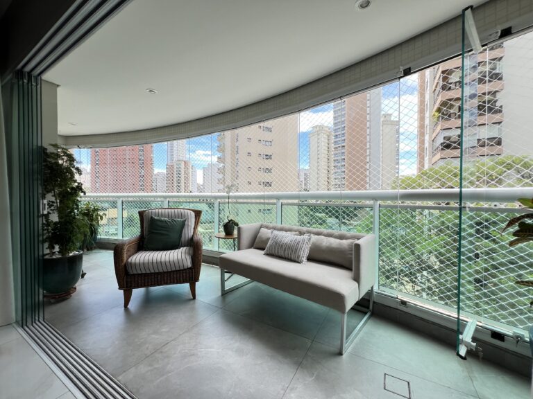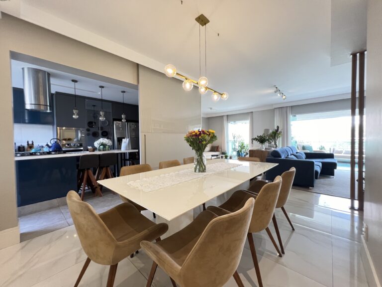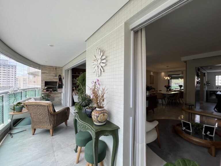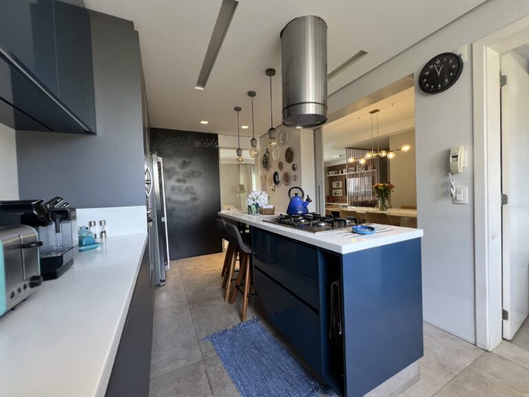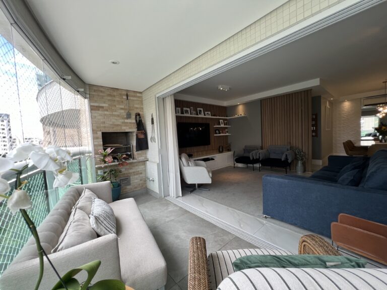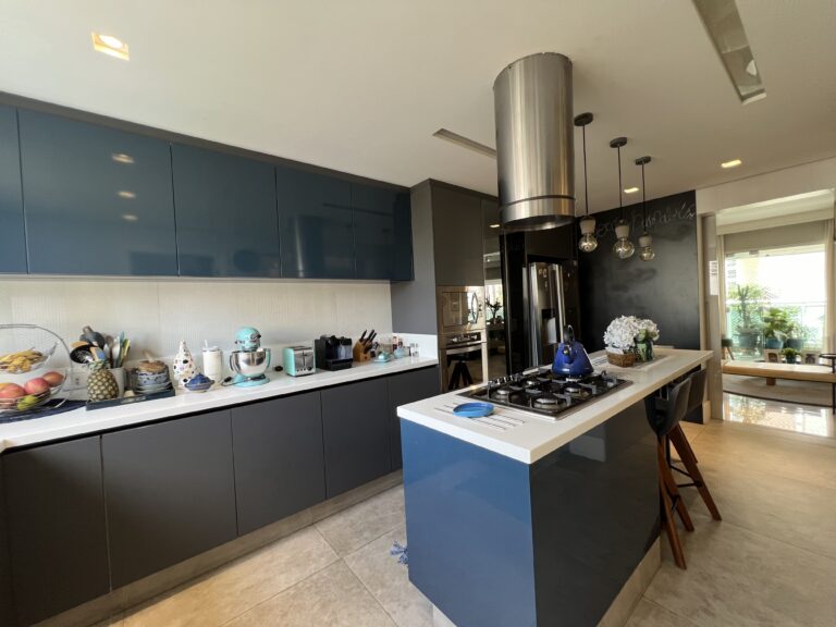 Com 176 m², conta com três suítes amplas, repletas de armários, sendo a Master com espaçoso closet e varanda privativa. O living ampliado se integra à varanda gourmet, que possui fechamento em vidro, piso nivelado e churrasqueira. A cozinha planejada, com ilha central, vem equipada com eletrodomésticos de alto padrão.