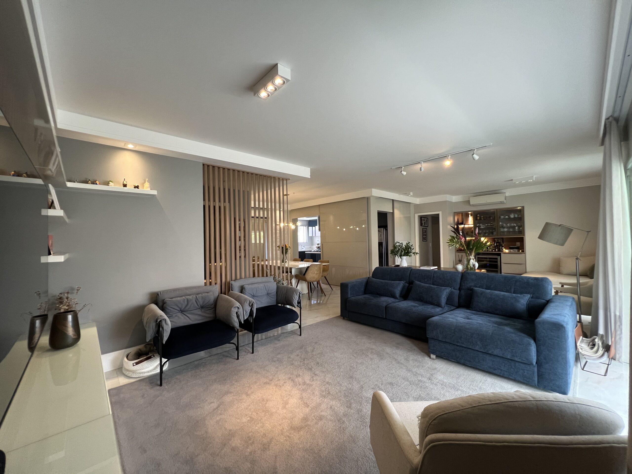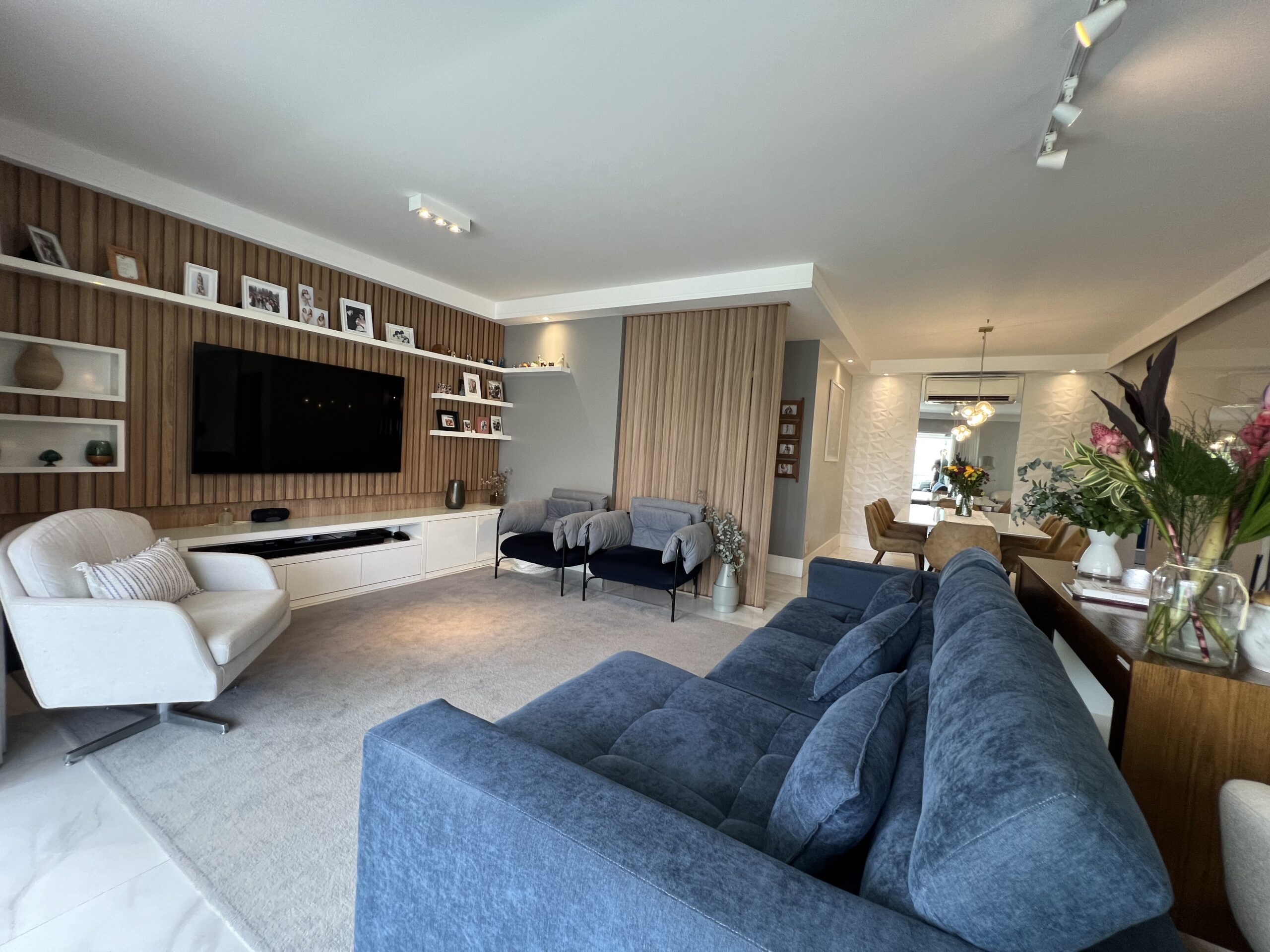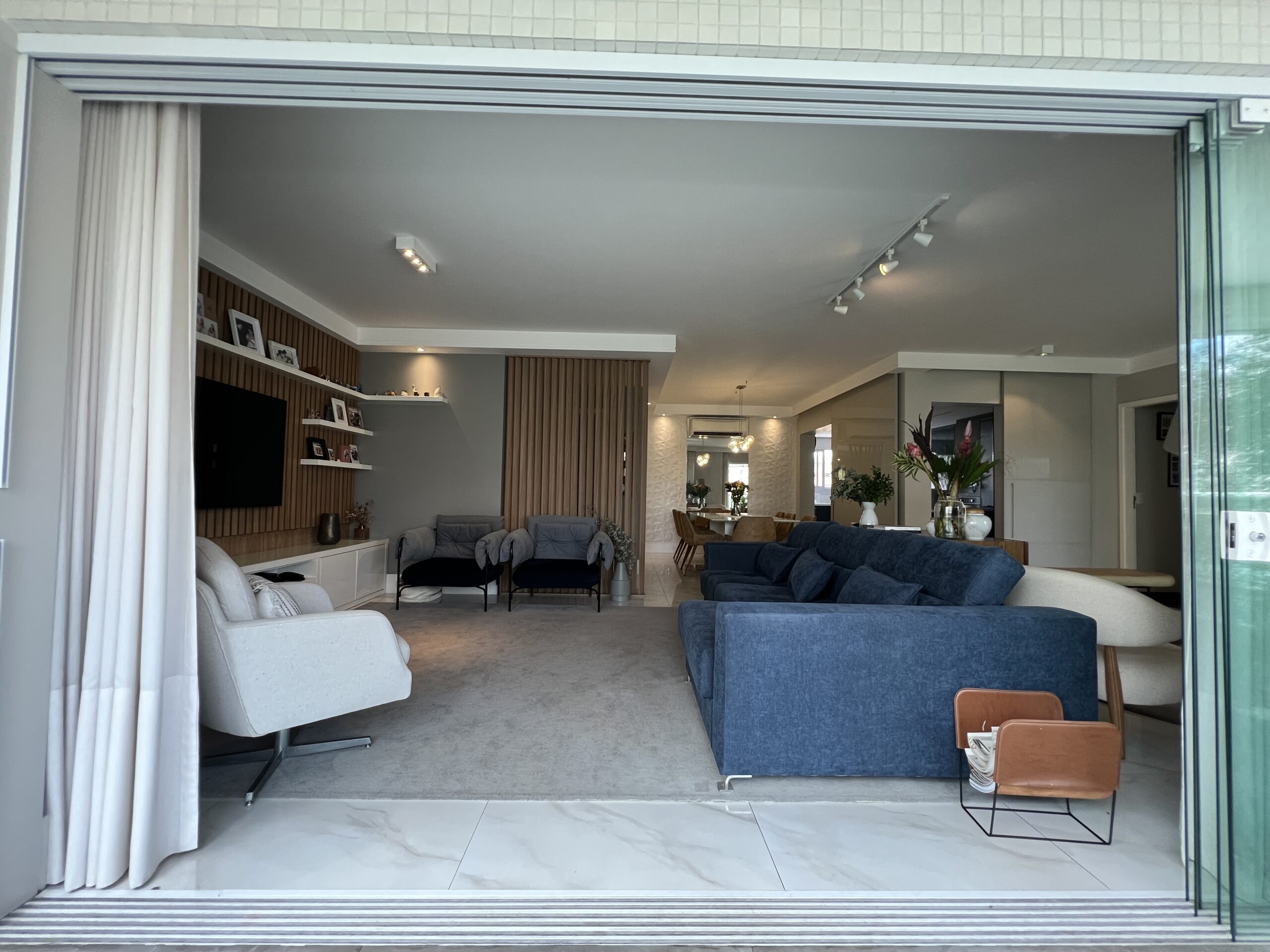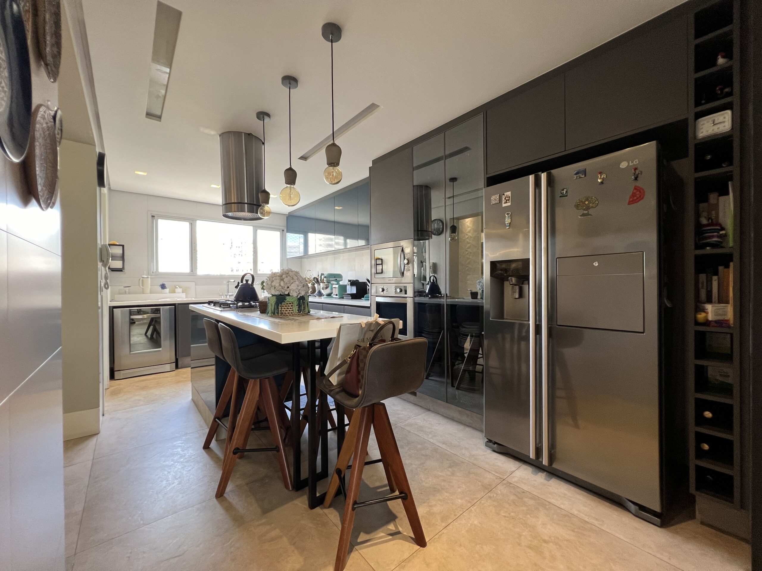 Com 176 m², conta com três suítes amplas, repletas de armários, sendo a Master com espaçoso closet e varanda privativa. O living ampliado se integra à varanda gourmet, que possui fechamento em vidro, piso nivelado e churrasqueira. A cozinha planejada, com ilha central, vem equipada com eletrodomésticos de alto padrão.