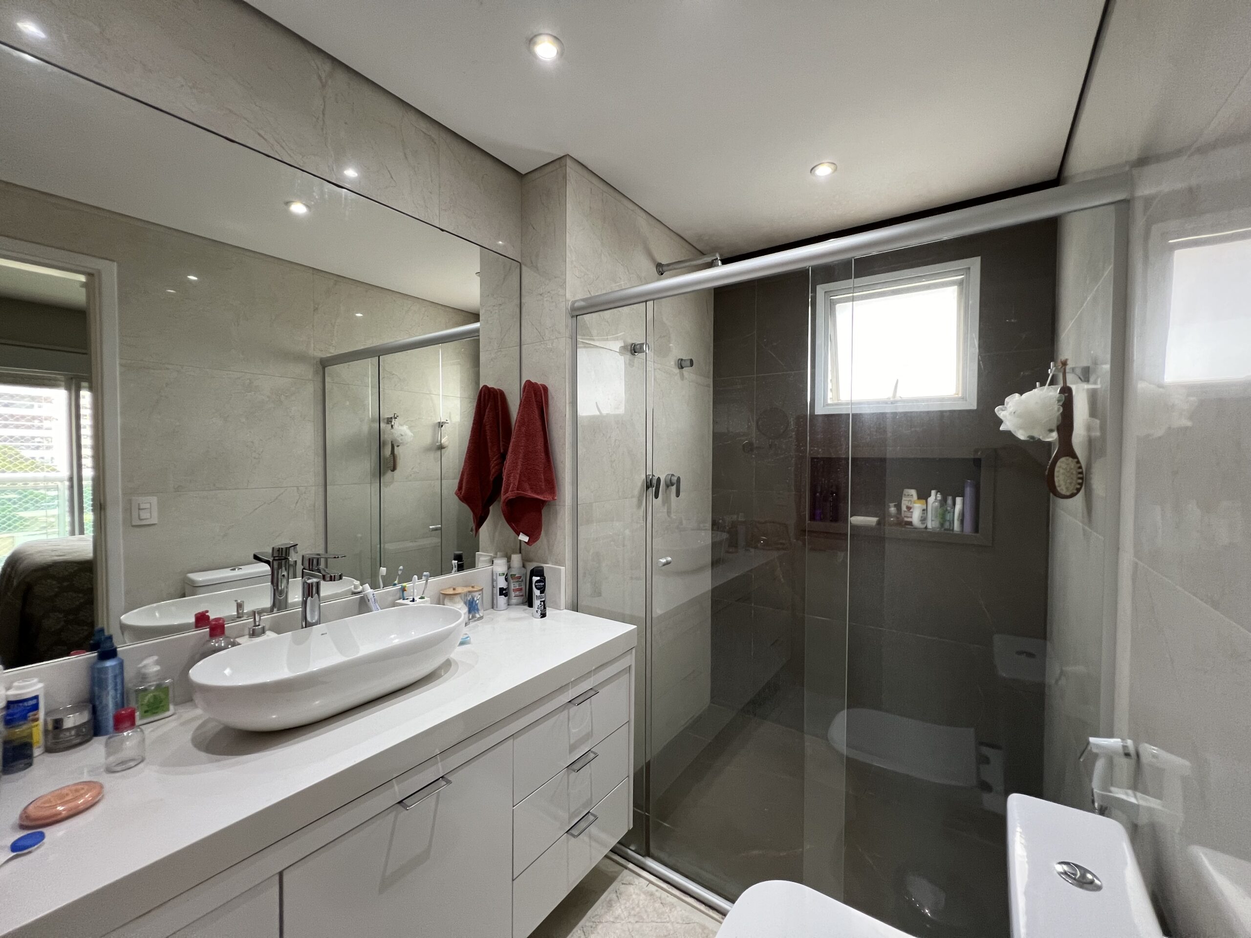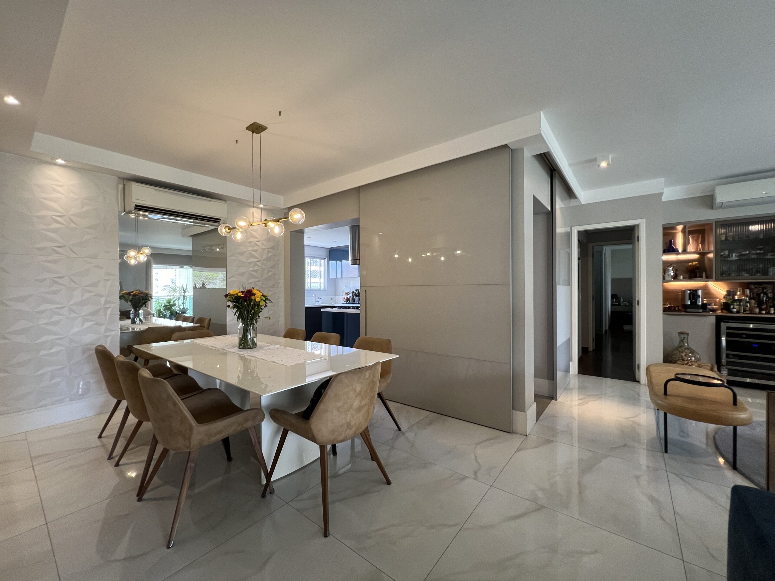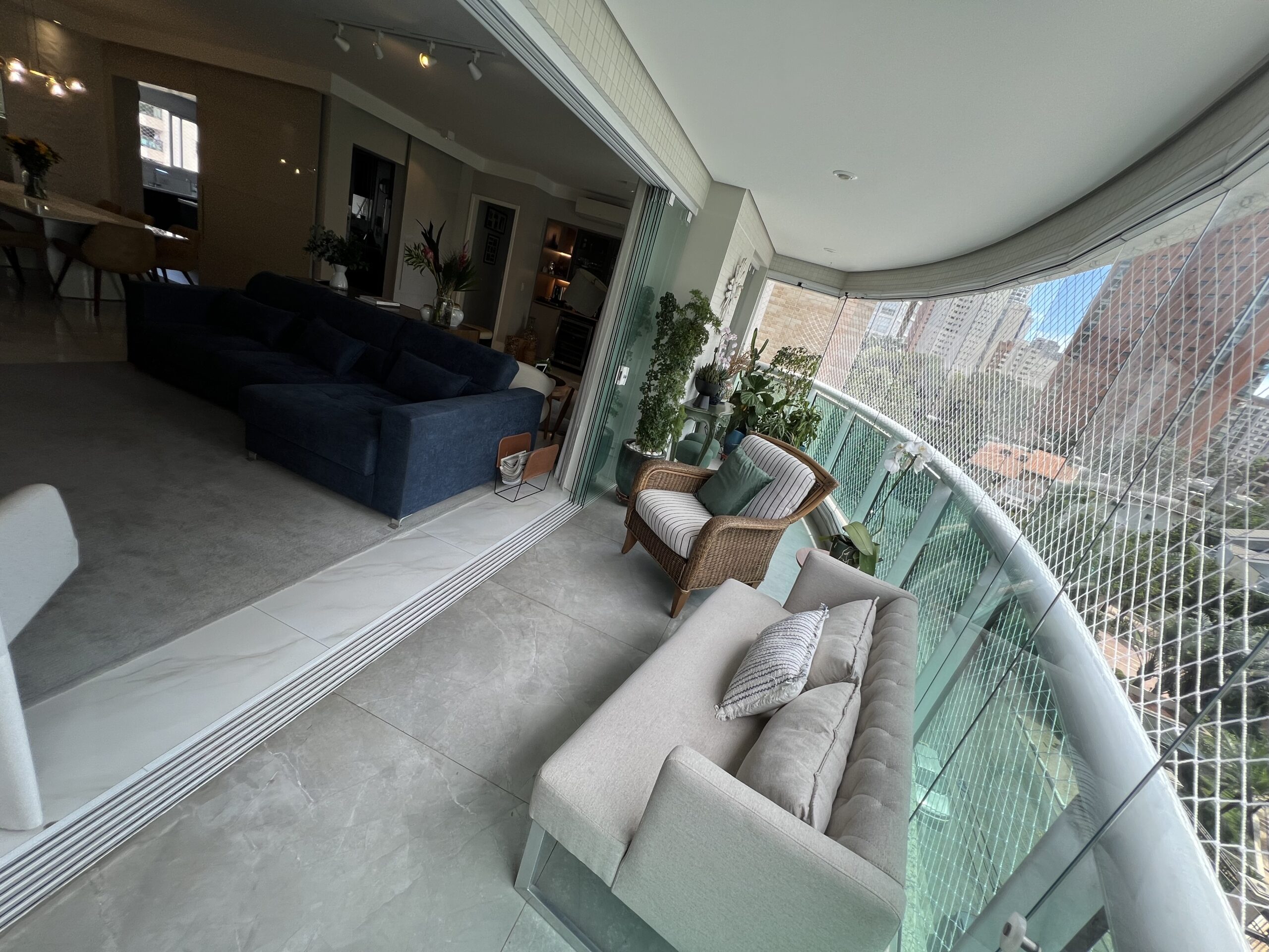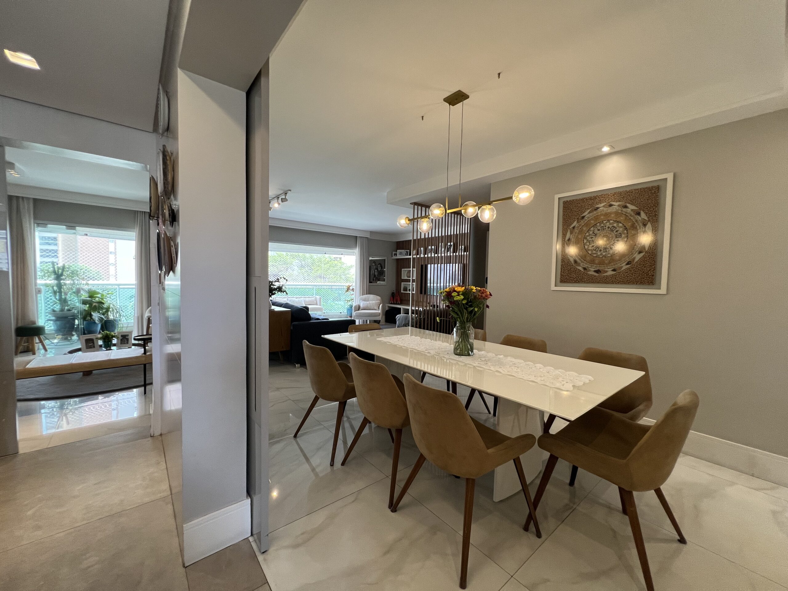 Com 176 m², conta com três suítes amplas, repletas de armários, sendo a Master com espaçoso closet e varanda privativa. O living ampliado se integra à varanda gourmet, que possui fechamento em vidro, piso nivelado e churrasqueira. A cozinha planejada, com ilha central, vem equipada com eletrodomésticos de alto padrão.