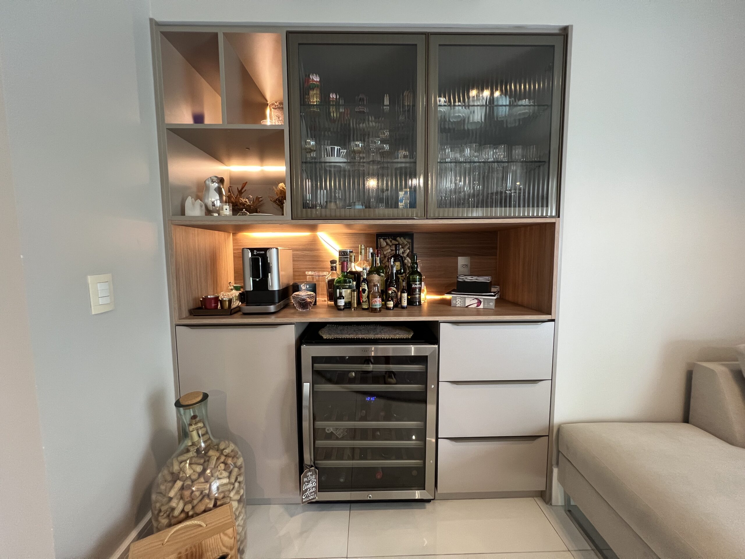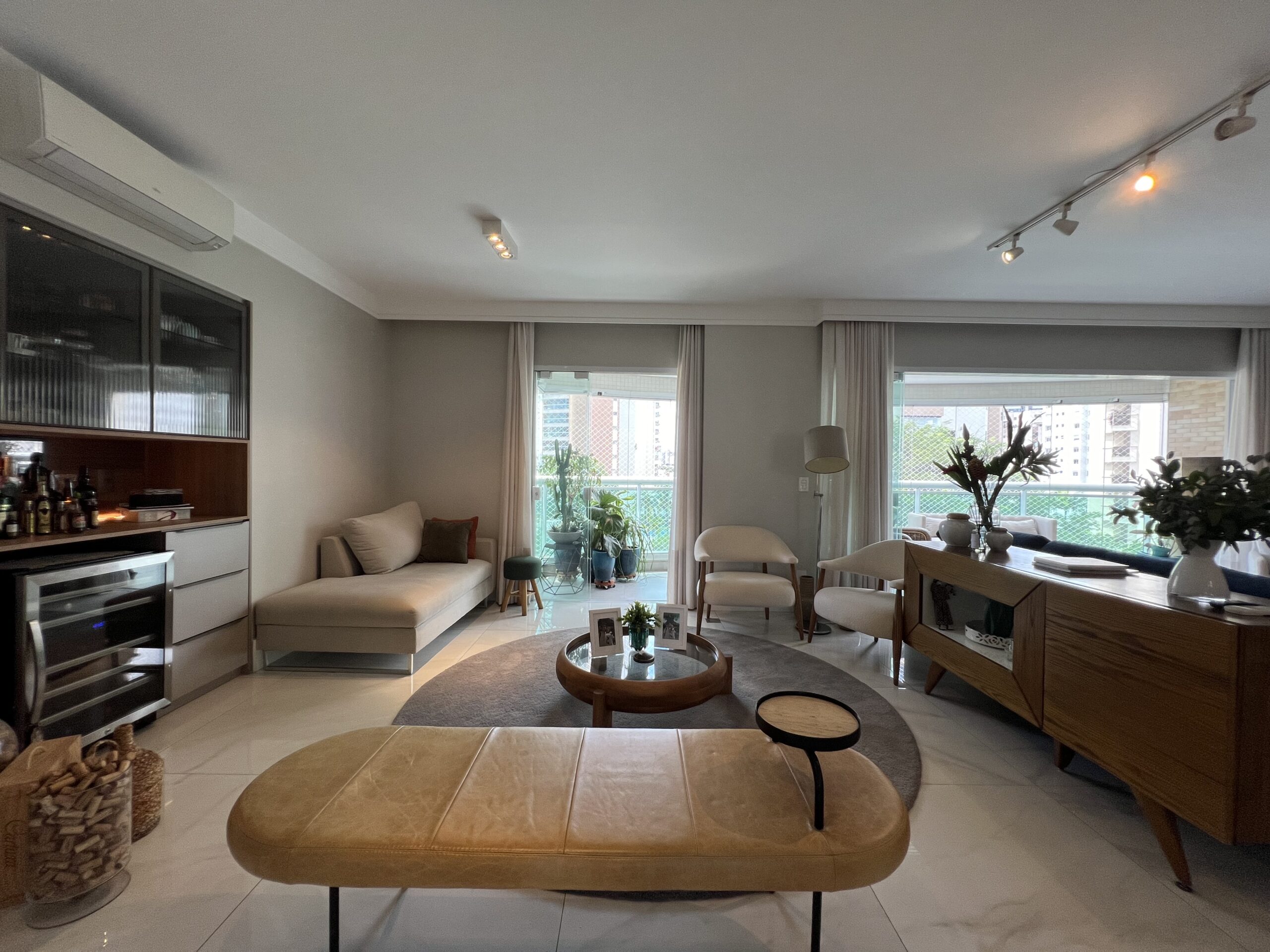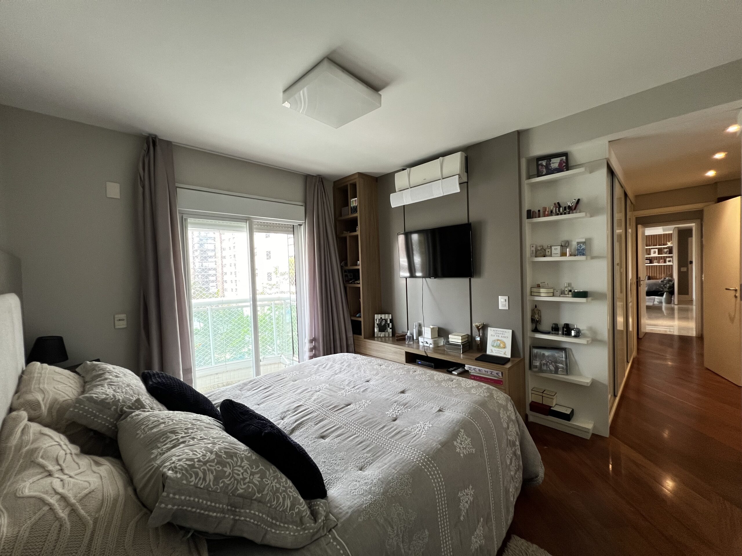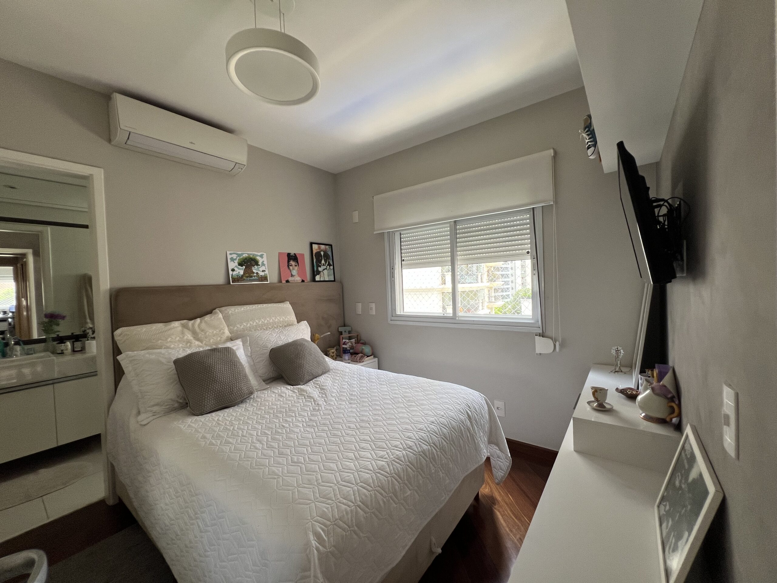 Com 176 m², conta com três suítes amplas, repletas de armários, sendo a Master com espaçoso closet e varanda privativa. O living ampliado se integra à varanda gourmet, que possui fechamento em vidro, piso nivelado e churrasqueira. A cozinha planejada, com ilha central, vem equipada com eletrodomésticos de alto padrão.
