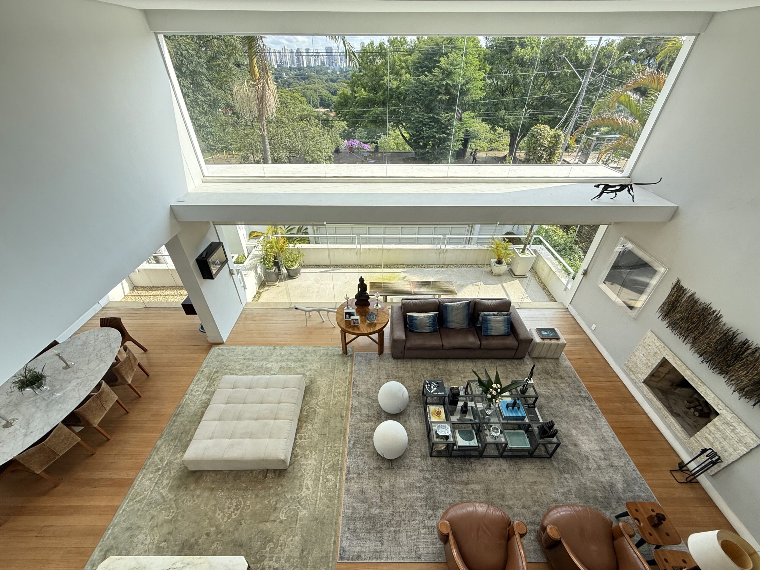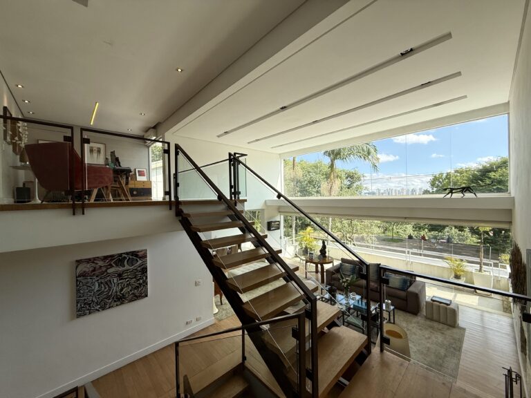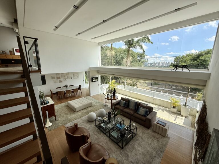 Ao cair da tarde, o amplo living com pé-direito duplo e grandes aberturas em vidro, somado ao magnífico terraço superior, oferecem um espetáculo particular com vista direta para a Praça do Pôr do Sol, transformando o horizonte de São Paulo em parte da sua decoração.