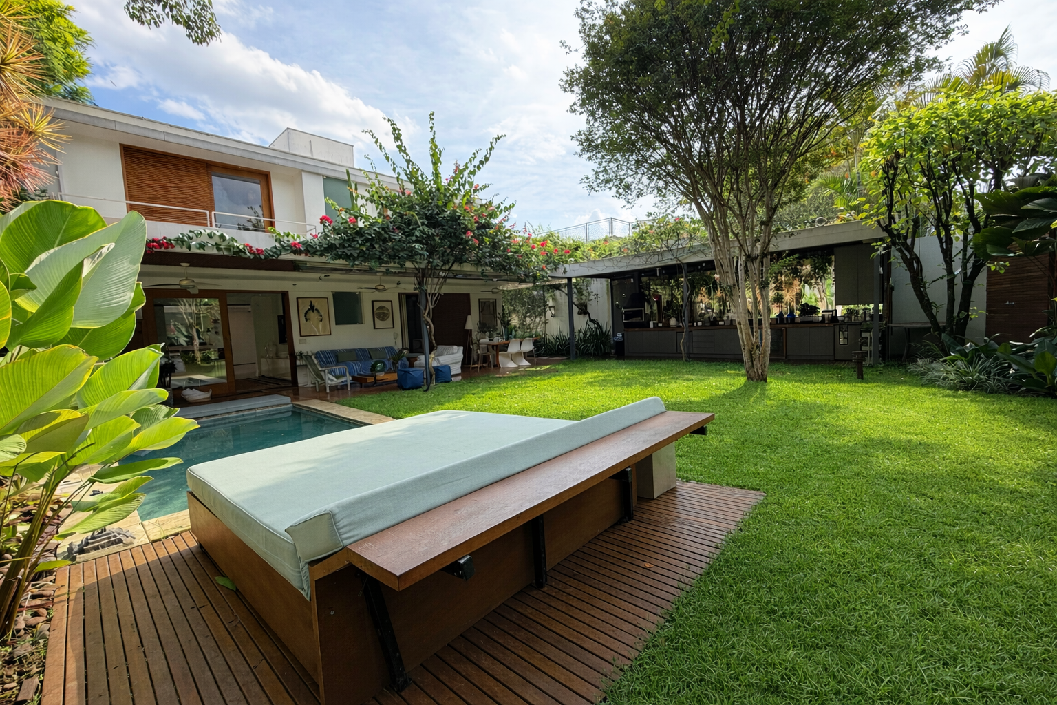 A área externa possui varanda coberta com sala de estar, piscina, área gourmet, que compõem um agradável espaço de convivência externo .Uma casa feita para quem gosta de receber com sofisticação, mas não abre mão daquele clima de “casa de campo” urbana.