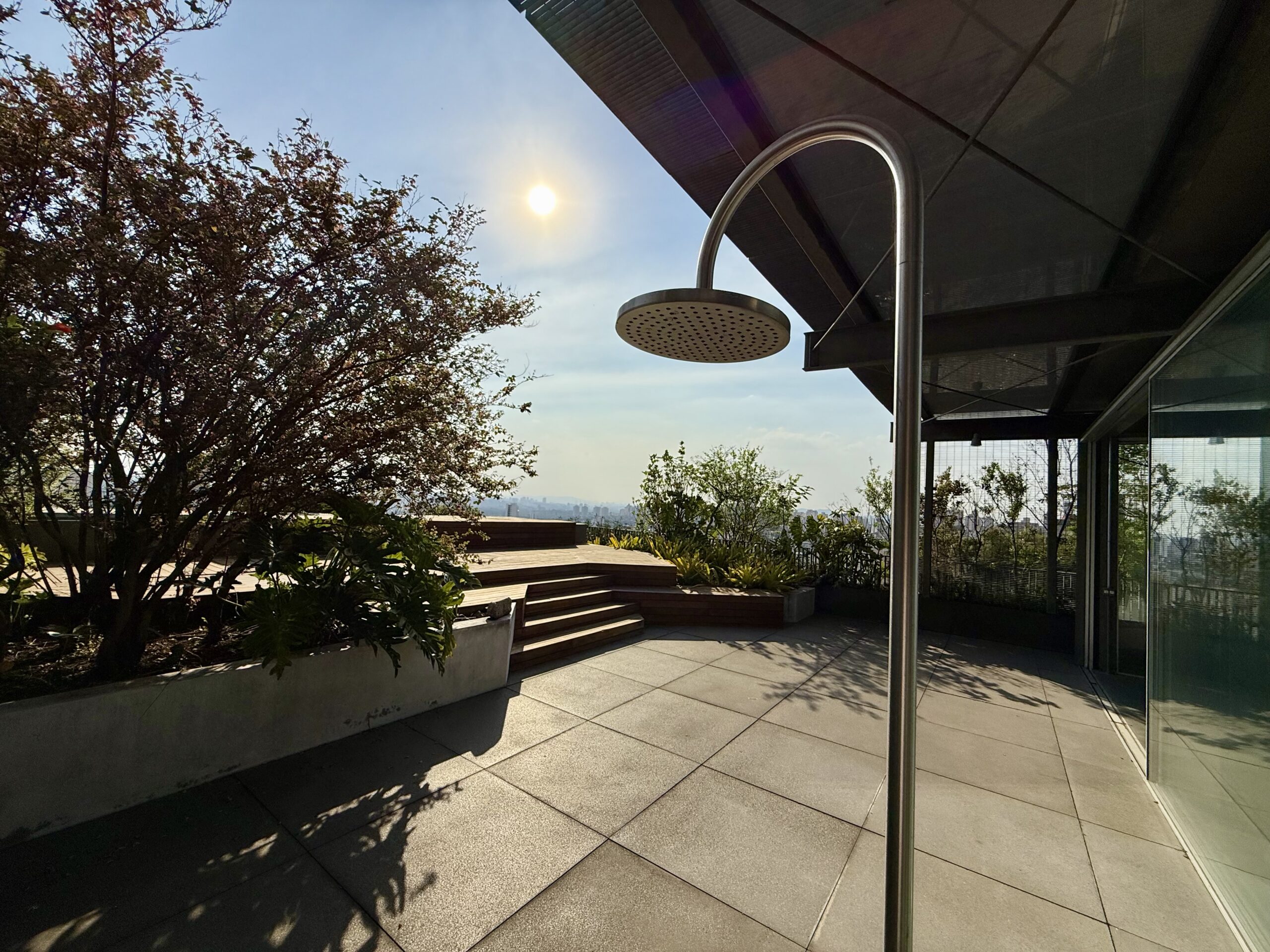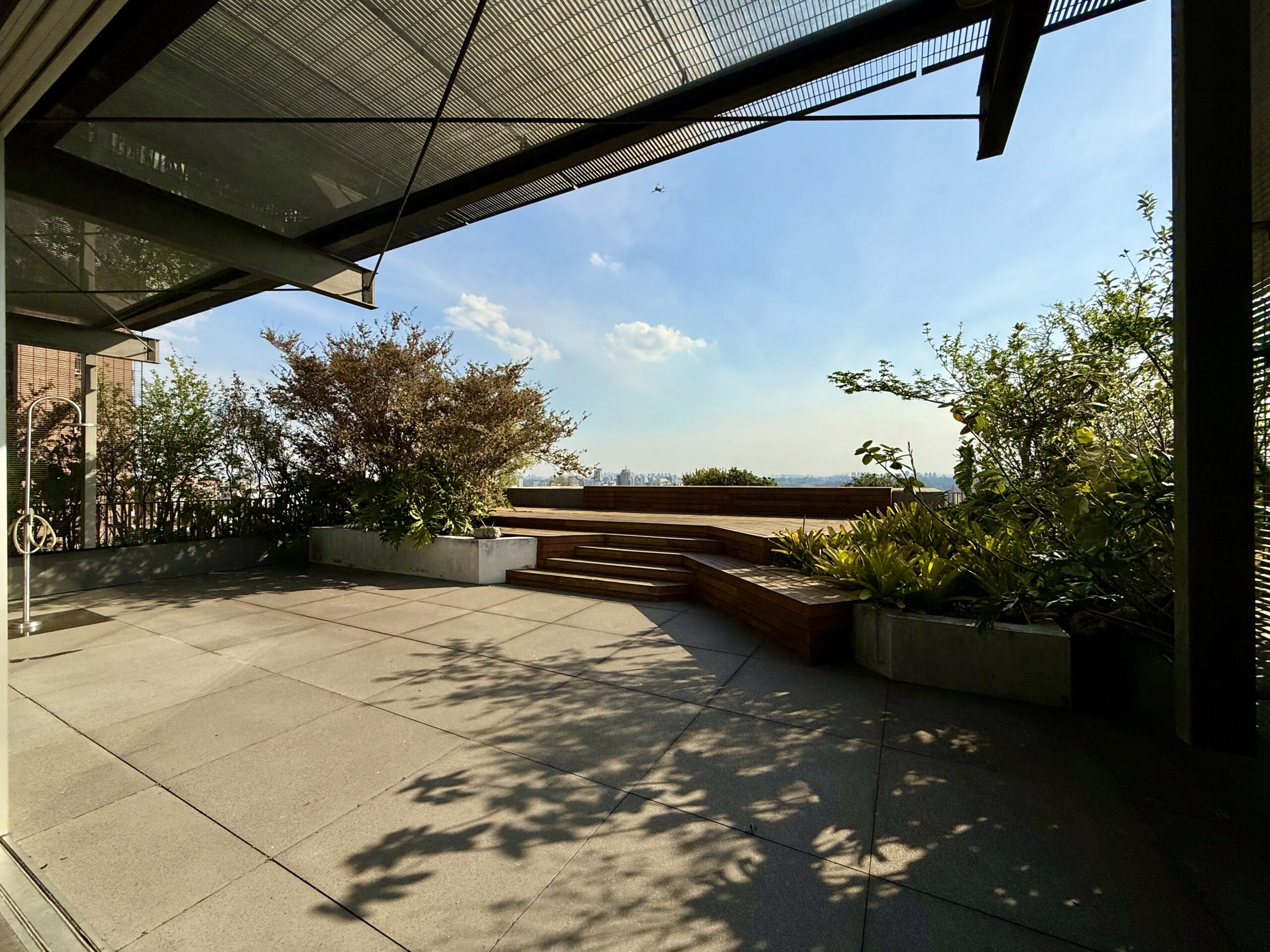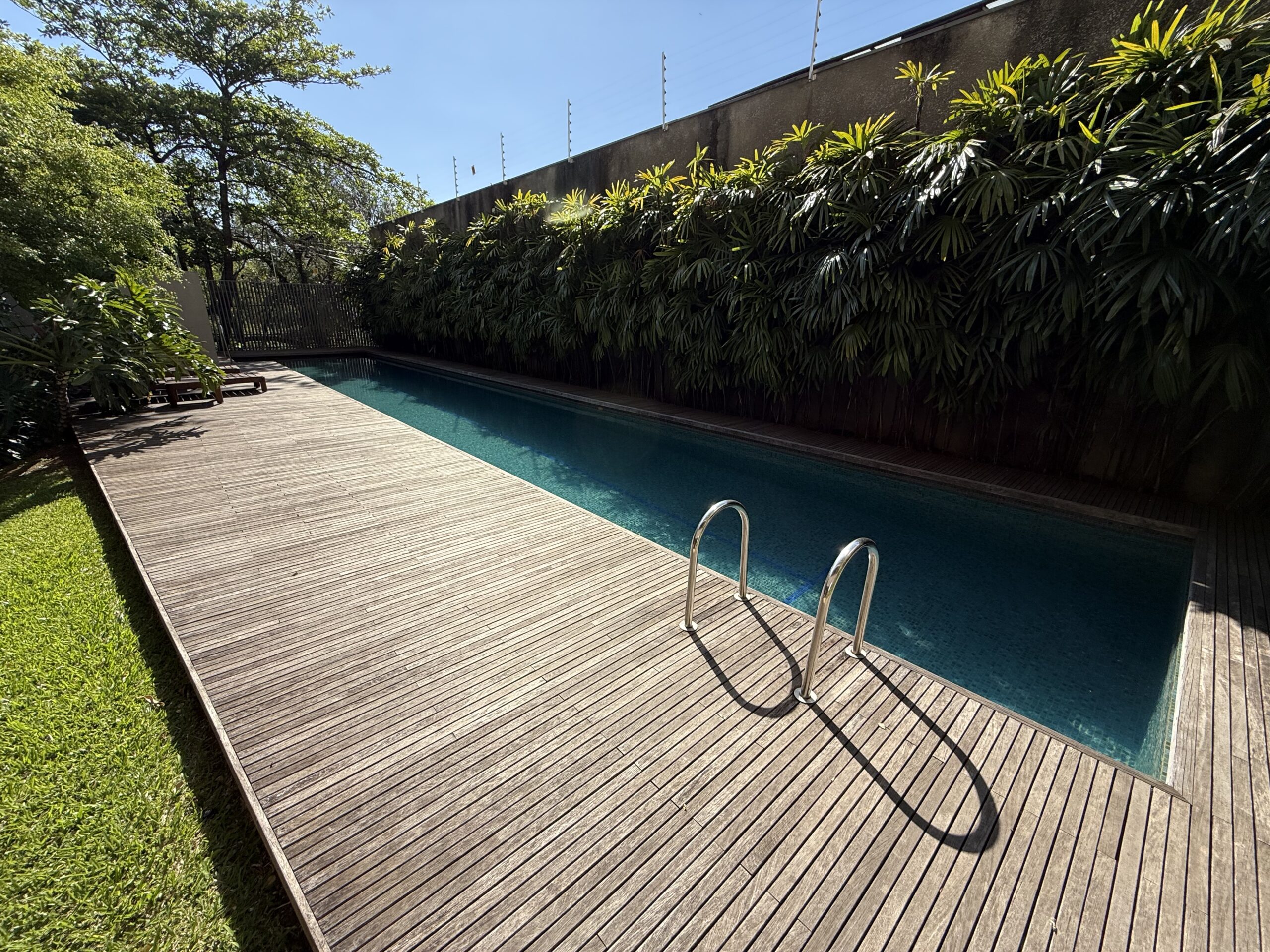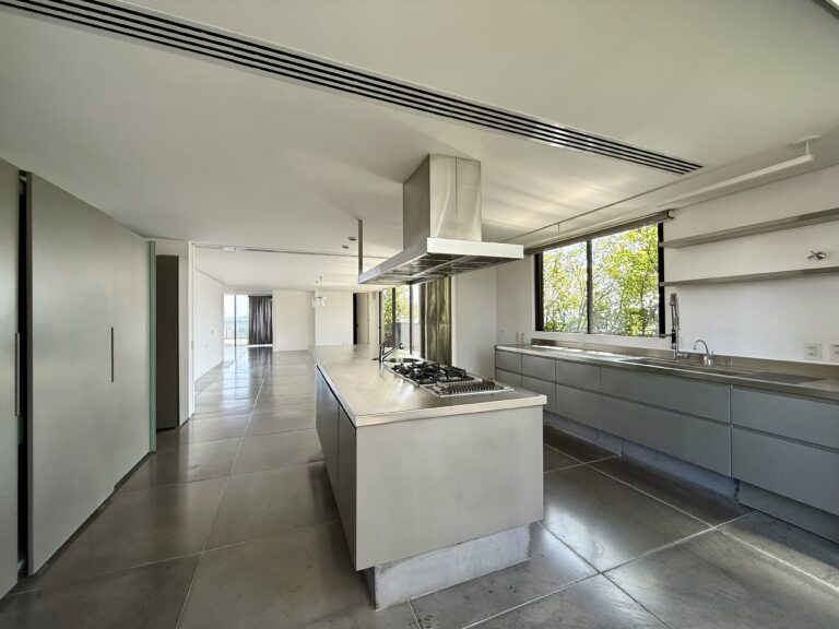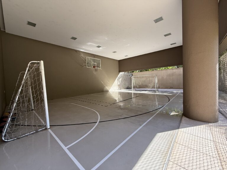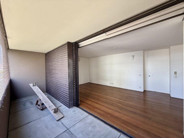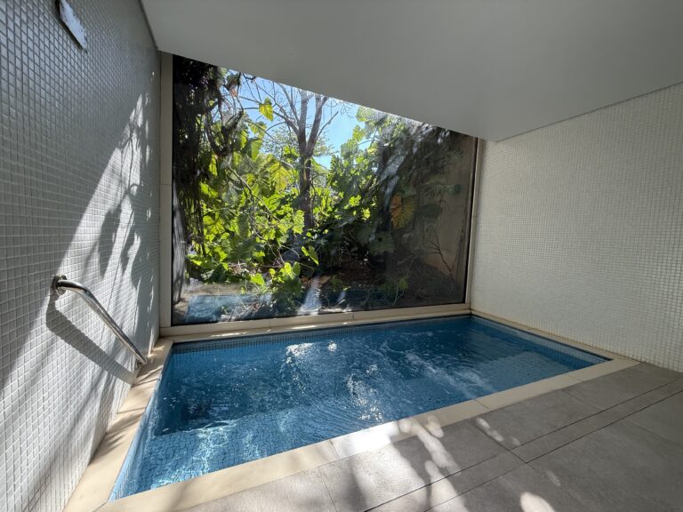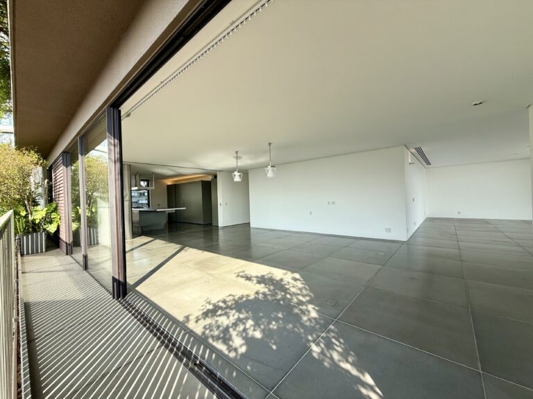 O apartamento de generosos 846 m², possui amplos terraços por todos os lados, sendo o superior com piscina digna de casa. Janelas piso teto com vidro duplo, ar condicionado dutado e a marcenaria é Securit em todo o imóvel. São três quartos, sendo duas suítes amplas, e seis vagas de garagem.