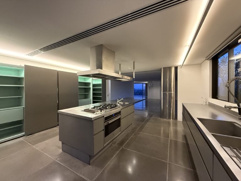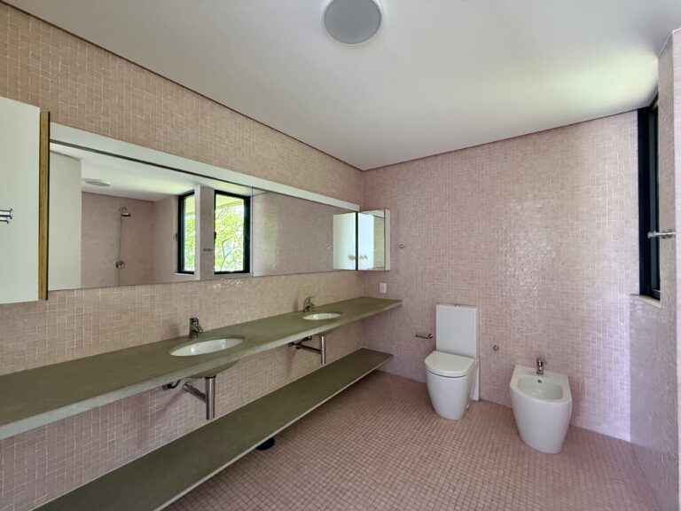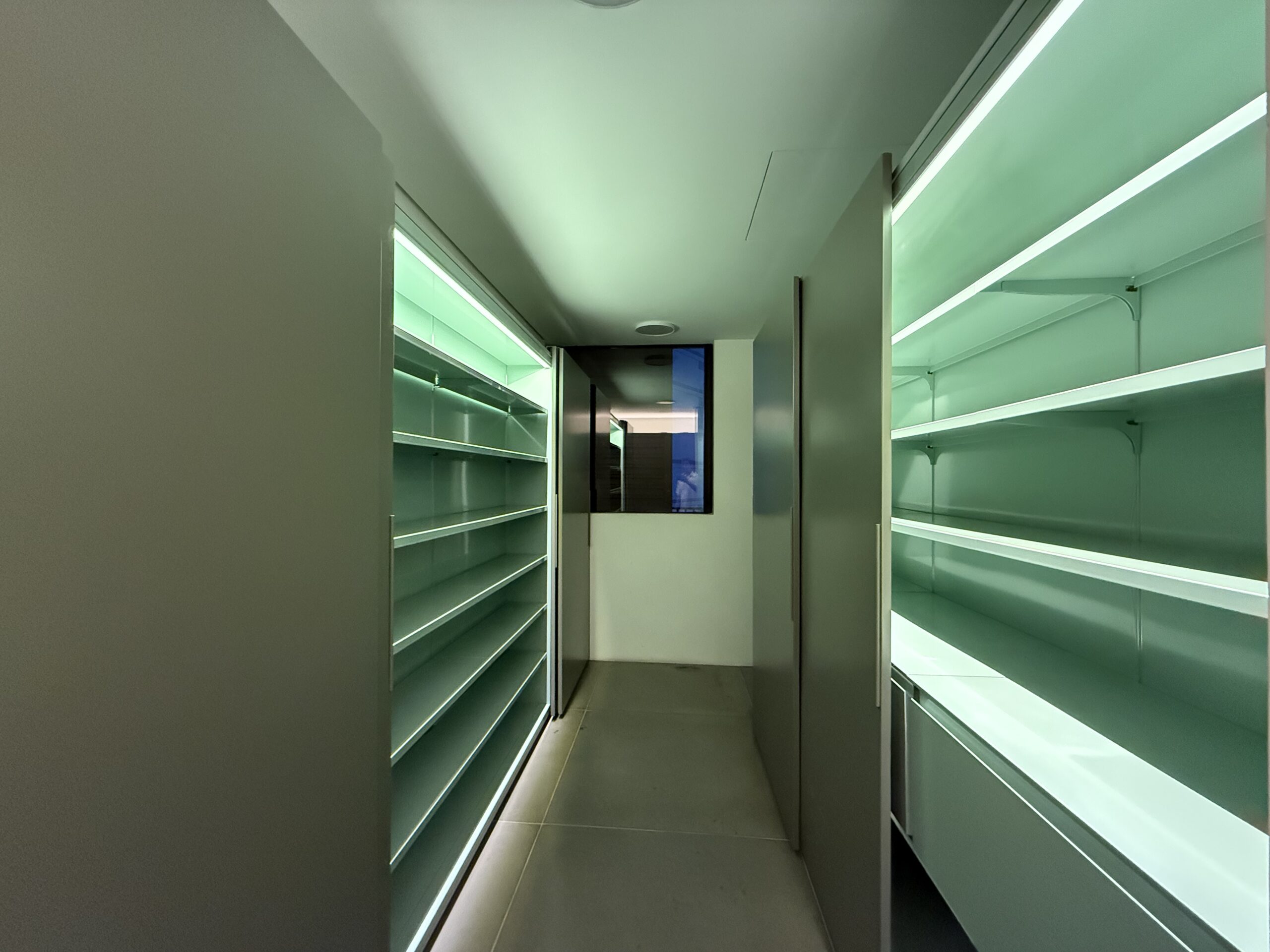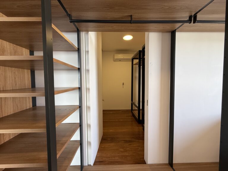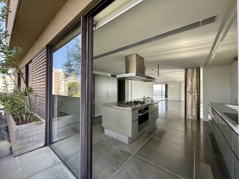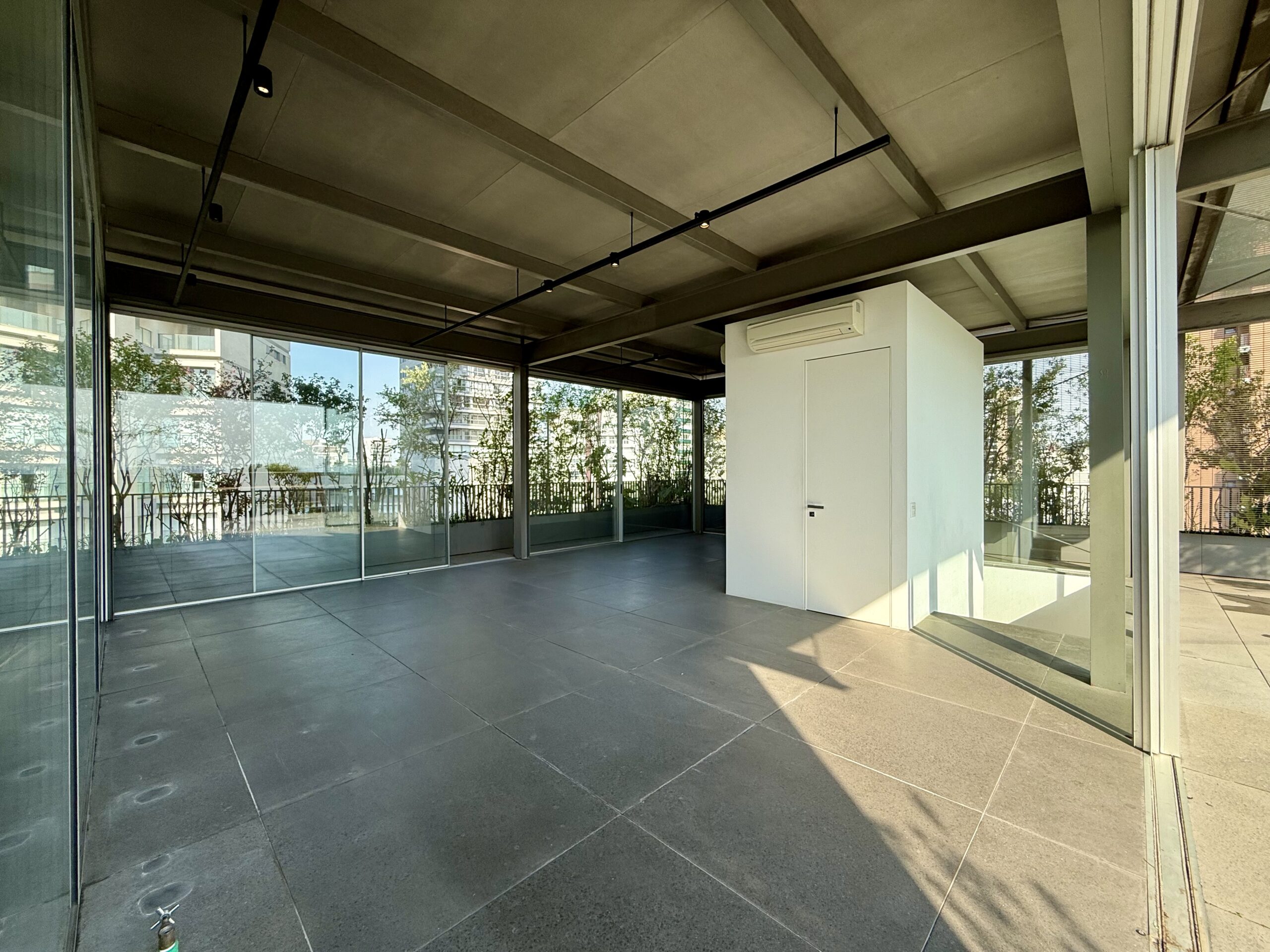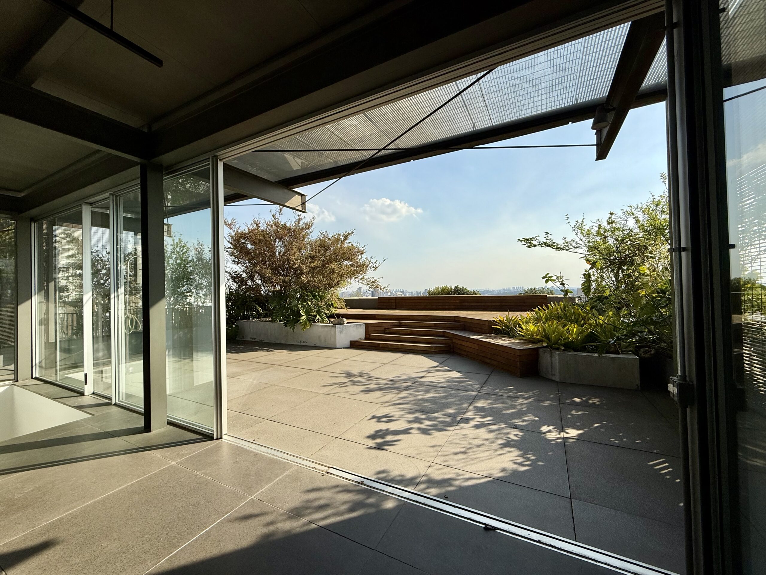 O apartamento de generosos 846 m², possui amplos terraços por todos os lados, sendo o superior com piscina digna de casa. Janelas piso teto com vidro duplo, ar condicionado dutado e a marcenaria é Securit em todo o imóvel. São três quartos, sendo duas suítes amplas, e seis vagas de garagem.