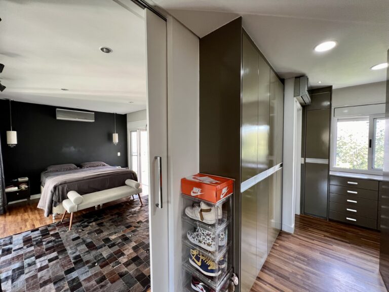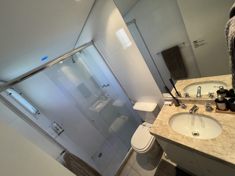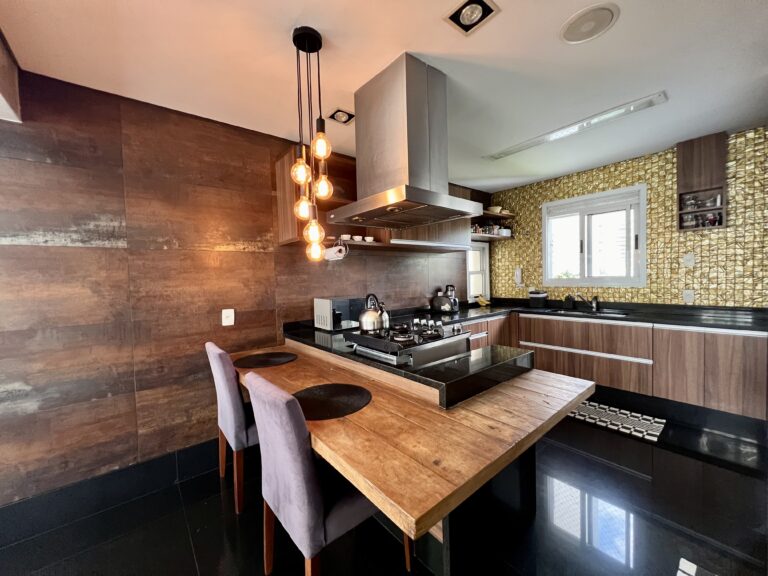 A cozinha americana, integrada à área social, reforça a proposta de praticidade e convivência. Na área íntima, o duplex possui duas suítes, sendo a master um verdadeiro refúgio, com closet espaçoso, armários planejados e um banheiro amplo e iluminado.