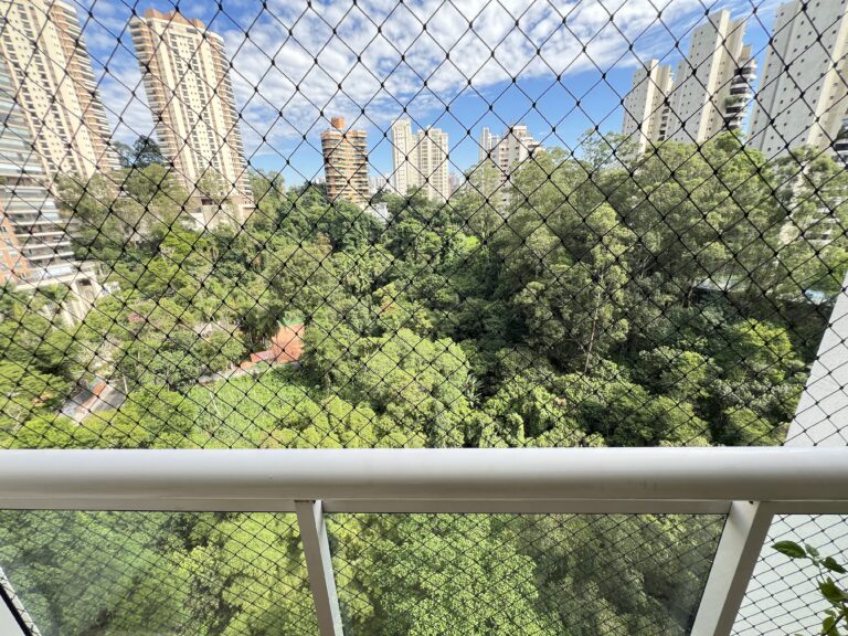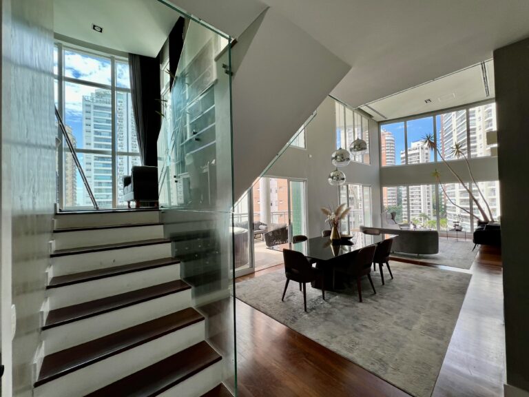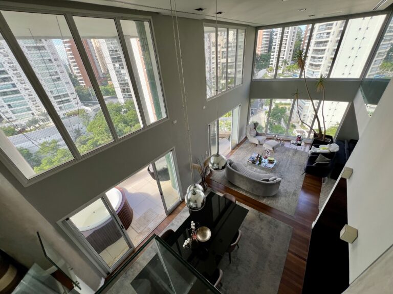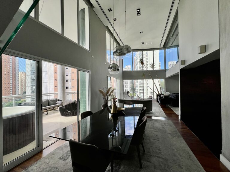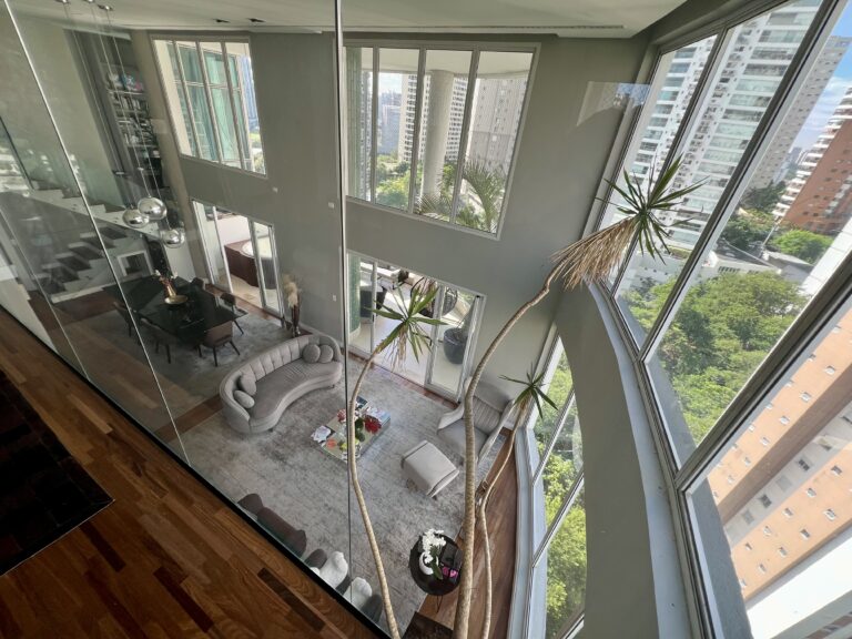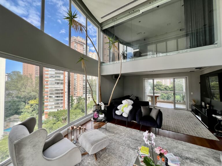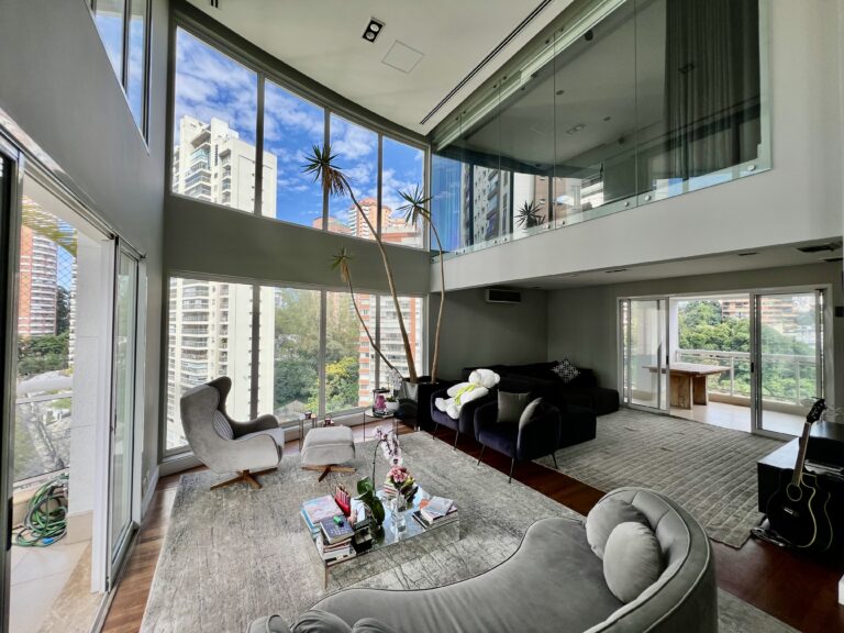 Com apenas um apartamento por andar, o imóvel oferece total privacidade e uma vista permanente para um frondoso bosque, graças à sua arquitetura totalmente envidraçada. A área social conta com uma ampla sala distribuída em três ambientes, lavabo, um escritório perfeito para home office e duas varandas – uma delas equipada com jacuzzi e churrasqueira, ideal para momentos de lazer e contemplação.