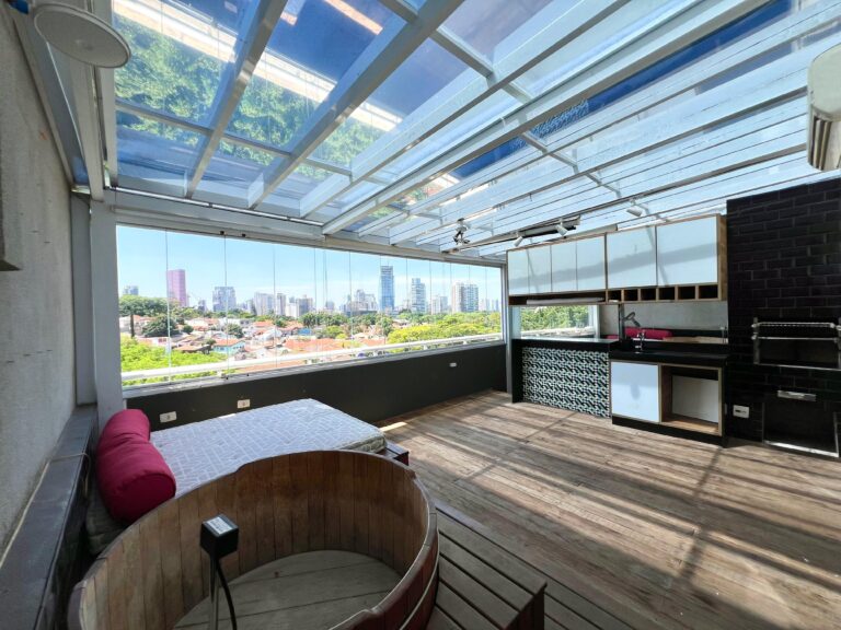 Revestido em madeira de demolição, o agradável Rooftop possui ofurô, teto retrátil motorizado, churrasqueira, projetor, ar condicionado, e vista livre p/ o verde do Alto de Pinheiros.