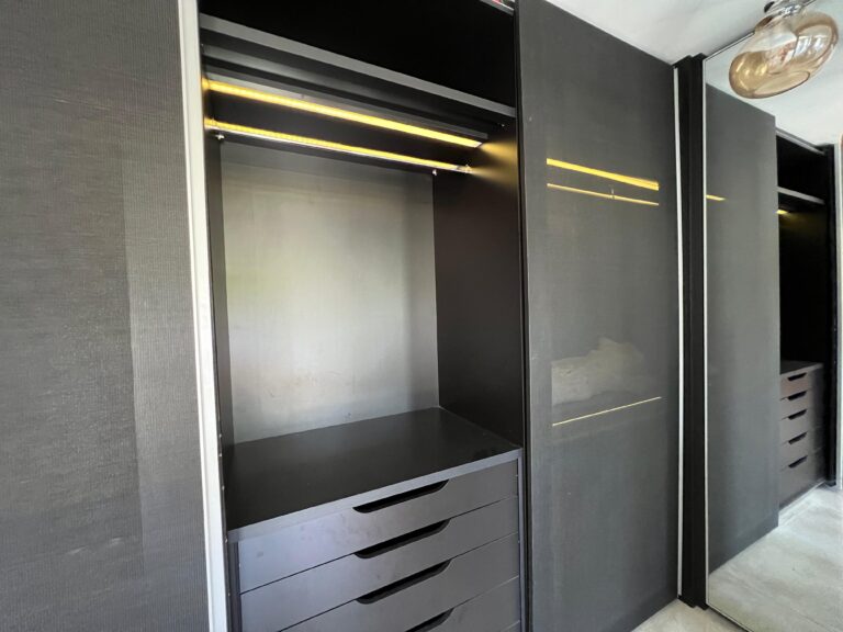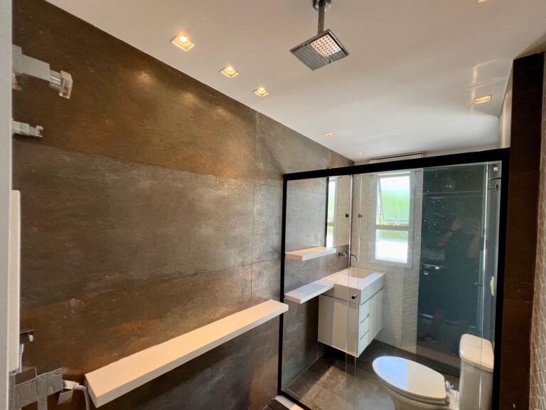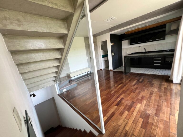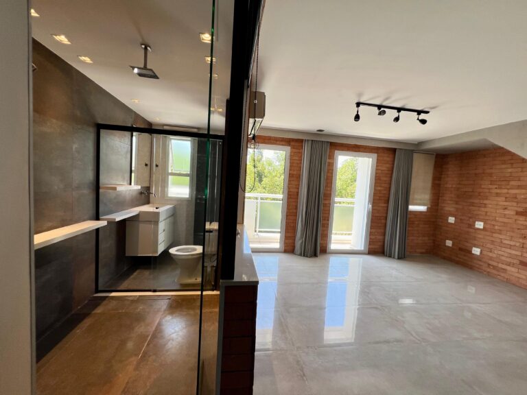 No piso inferior, ampla suíte de 30 metros quadrados com ar condicionado, janelas anti-ruído, acabamentos em tijolo aparente, marcenaria com iluminação interna, banheiro com chuveiro de teto e duas entradas e varanda própria, olhando p/ a copa das árvores.